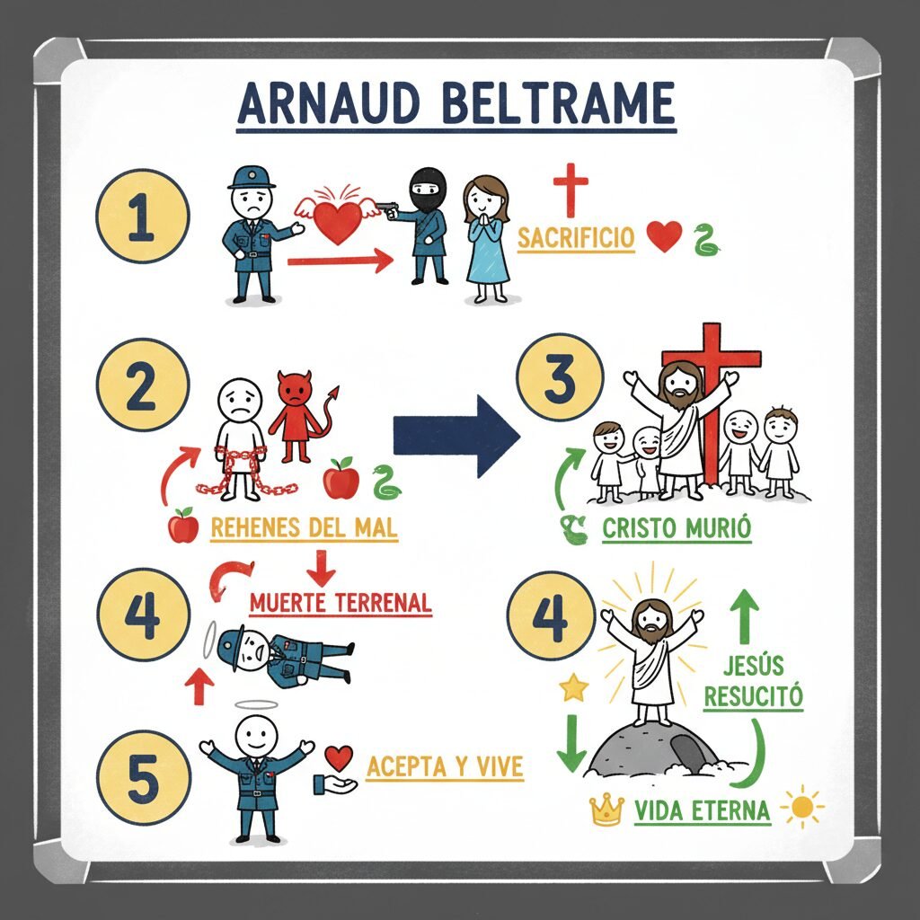 El coronel Beltrame murió y, por desgracia, no puede volver a la vida en esta tierra. Pero Jesús, el Hijo de Dios, resucitó. Demostró que no era un “rehén” de la muerte, sino que es poderoso para salvar a todos los que creen en él. Así como el coronel tomó voluntariamente el lugar del rehén, Jesucristo tomó su lugar y murió por usted. Acéptelo como su Salvador personal, y será salvo. Él le da la vida, una vida que va mucho más allá de su existencia en la tierra. Porque Jesucristo ¡es la vida eterna!