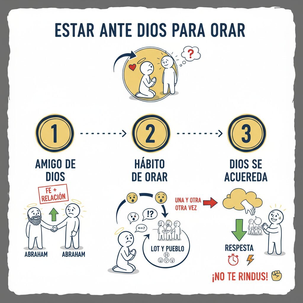 Esta vida de fe y confianza tiene su fuente en la intimidad entre Abraham y Dios, cultivada regularmente, como un hábito de vida. Se quedaba “aún” ante Dios: esta expresión nos muestra que ese era su modo de vida. Llevaba a Dios sus preocupaciones, sus dudas, sus preguntas, sus peticiones para su pueblo. En este relato (Génesis 18), lo que le preocupa es el destino de su sobrino Lot. Nosotros también podemos preocuparnos por aquellos a quienes amamos, que están en una situación difícil o que se han alejado de Dios. Y la expresión “aún” nos muestra que Abraham oró una y otra vez por Lot, sin cansarse. En el siguiente capítulo lo vemos volver al lugar donde había orado antes por el mismo tema. Tal vez se preguntó por qué Dios parecía guardar silencio ante sus peticiones. Pero no fue así, pues en el momento decisivo, Dios se acordó de las oraciones de Abraham y respondió a su fe librando a su sobrino del juicio que estaba a punto de caer sobre la ciudad.