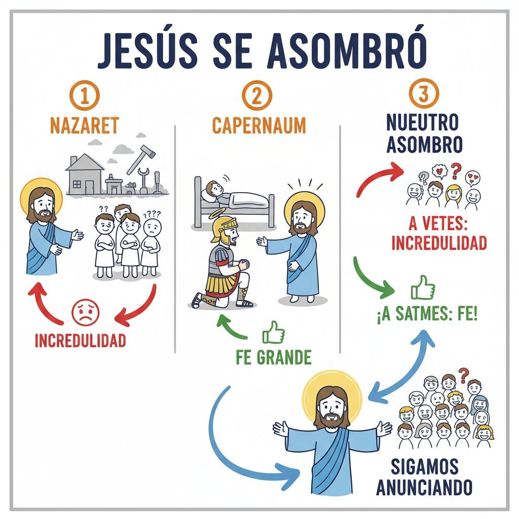 En los evangelios, dos veces vemos que Jesús se asombró, sea ante la incredulidad o ante la fe de aquellos que le rodeaban. No se trata de un asombro en el sentido de que Jesús se sorprendió por un acontecimiento inesperado, pues él es Dios y sabe todo de antemano.