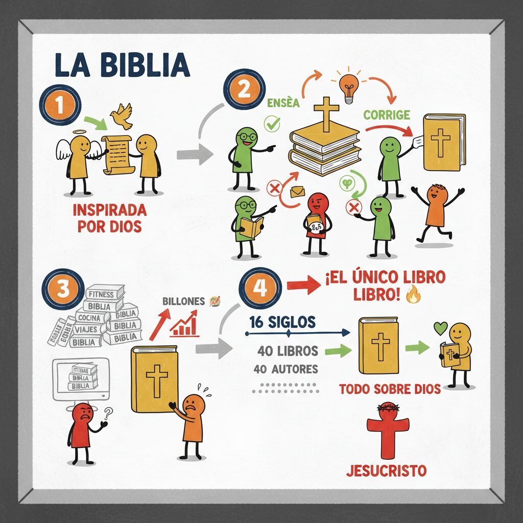 De hecho, la biblia está compuesta por 66 libros escritos por unos 40 autores diferentes, todos ellos inspirados directamente por Dios, a lo largo de unos 16 siglos. No es un libro de historia o de ciencia, no satisface nuestra curiosidad en todos los ámbitos, pero nos dice todo lo que necesitamos saber sobre Dios, sobre el hombre y su destino. Hace una descripción fiel de la naturaleza humana opuesta a Dios, y en contraste destaca el amor de Dios por su criatura. Su figura central es Jesucristo, el Hijo de Dios que vino a la tierra para dar su vida por la salvación del mundo.