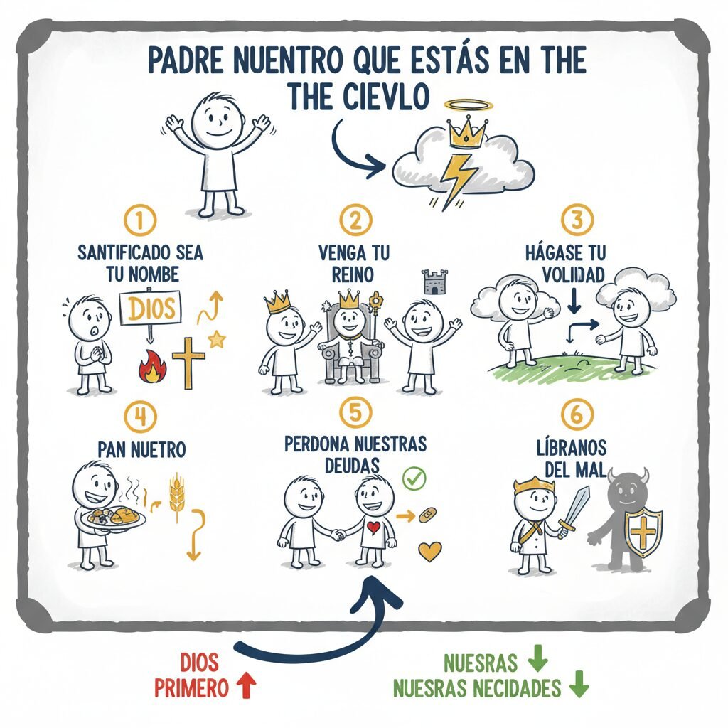 Padre nuestro que estás en los cielos, santificado sea tu nombre. Venga tu reino. Hágase tu voluntad, como en el cielo, así también en la tierra.
