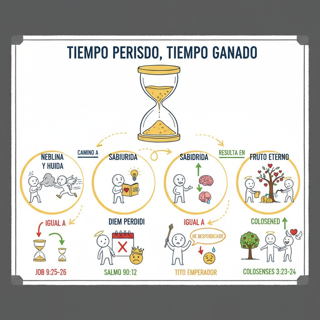 Según el historiador romano Suetonio, cuando el emperador Tito pasaba un día sin encontrar una oportunidad para hacer el bien, decía: «Diem perdidi» (He desperdiciado mi día). ¡Qué lección de sabiduría! Pero, ¿qué dice la biblia? “Mis días han sido más ligeros que un correo; huyeron, y no vieron el bien. Pasaron cual naves veloces; como el águila que se arroja sobre la presa” (Job 9:25-26). ¡Nadie puede retenerlos, ni volver a empezar uno de ellos!